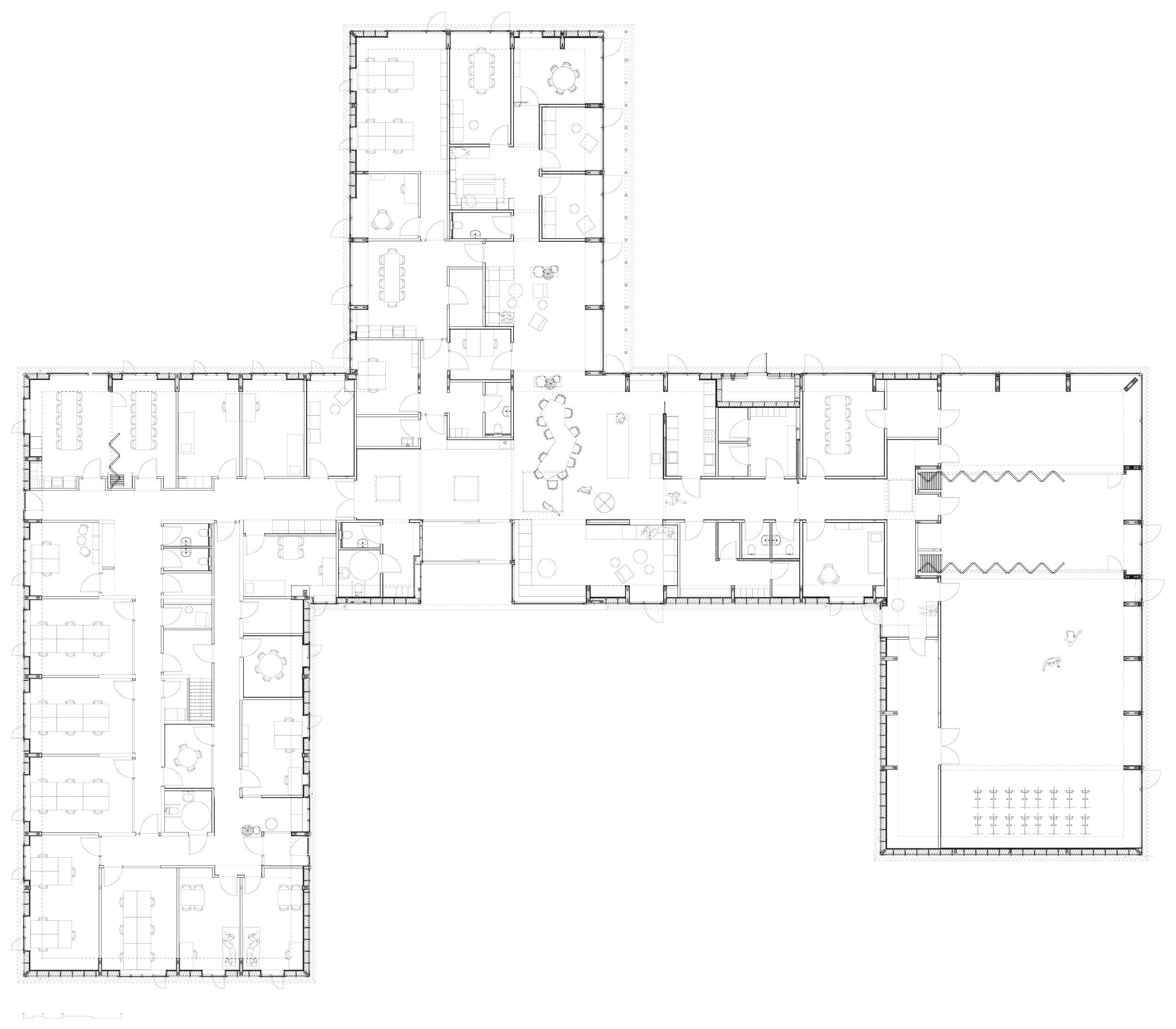 Udenfor trækker vilde beplantninger og haverummet sig helt tæt på bygningen. Det grønne udeareal er tænkt som et sanseligt og helende landskab. Her understøtter omgivelserne den mentale trivsel – som en del af et samlet helbredende miljø, hvor natur, nærvær og ro er i centrum.