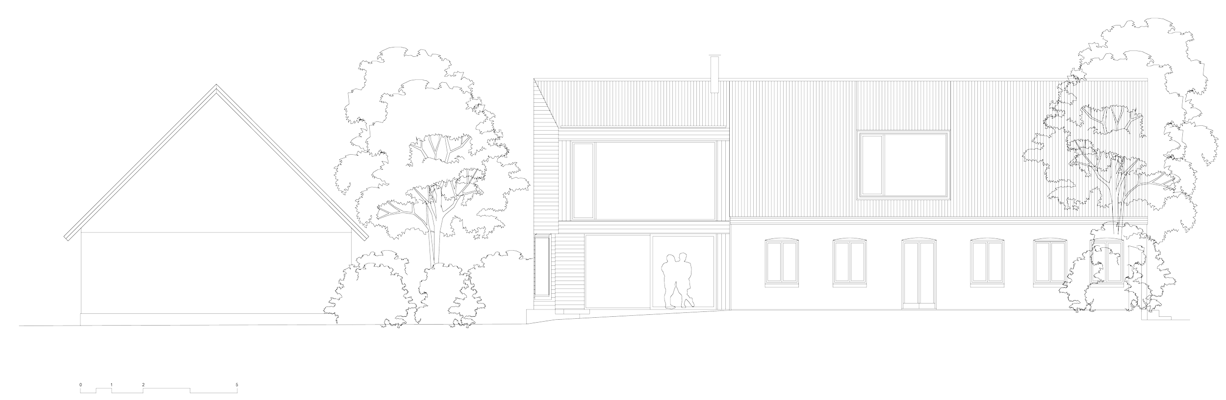 Den nye og den gamle bygningskrop samles under én sammenhængende tagflade i zink. Den eksisterende bygning og tilbygningen er kalket efter klassiske principper, “over stok og sten”, så både tegl og træ fremstår som en samlet helhed med en taktil, lys kalkflade. Indvendigt er materialeholdningen enkel og robust med trægulve, betongulve, eksisterende terrakottaklinker og vægge i fyrretræskrydsfiner.