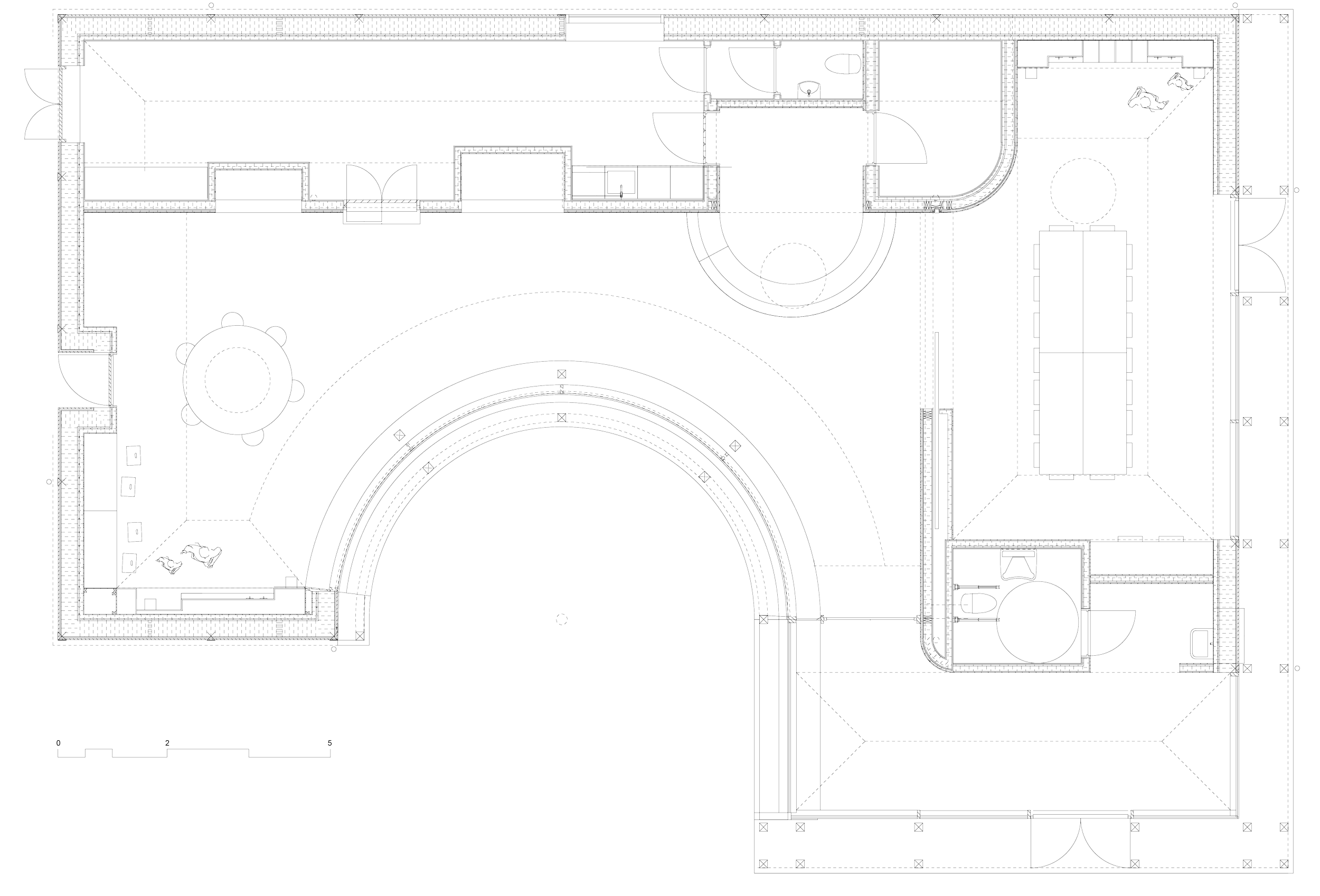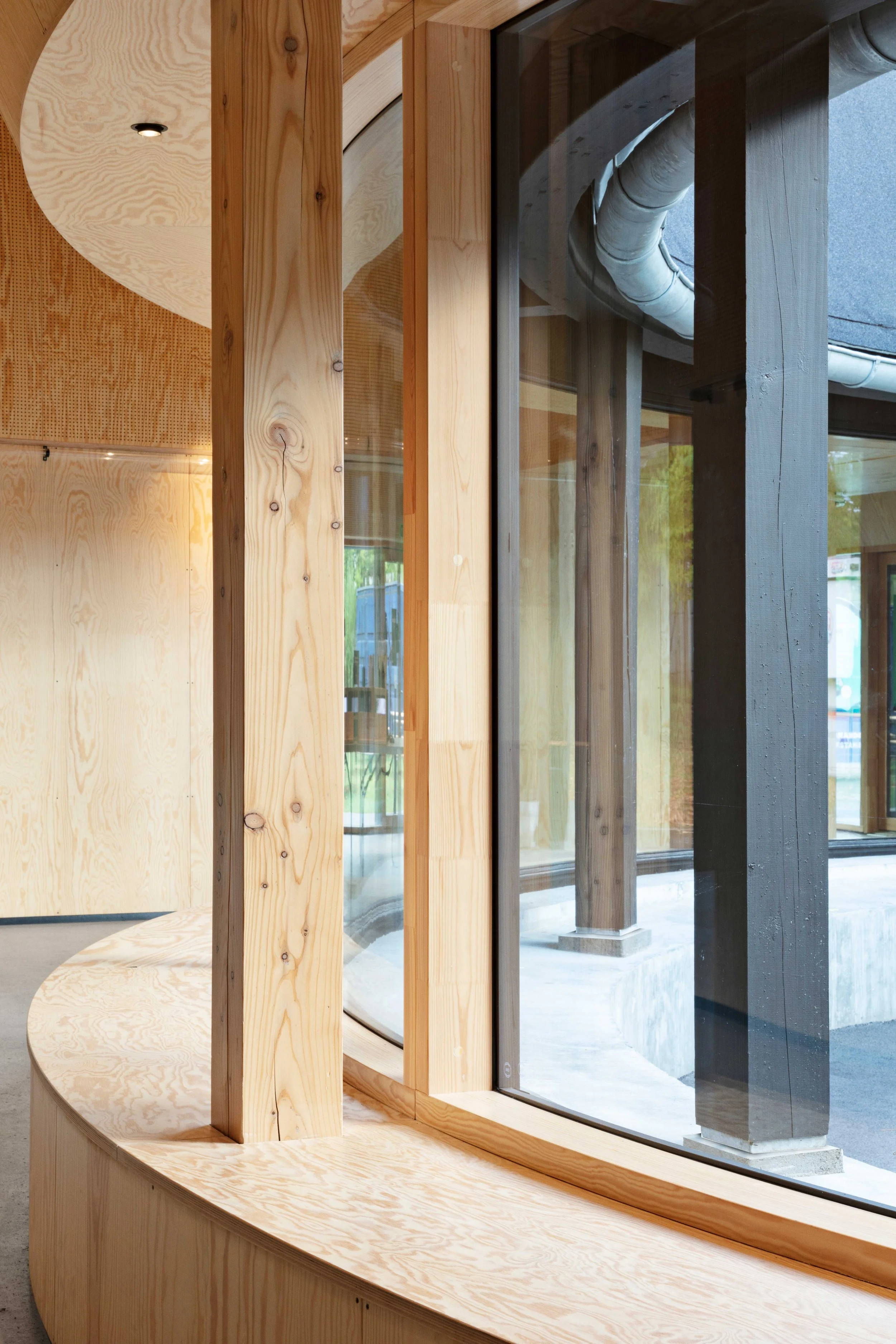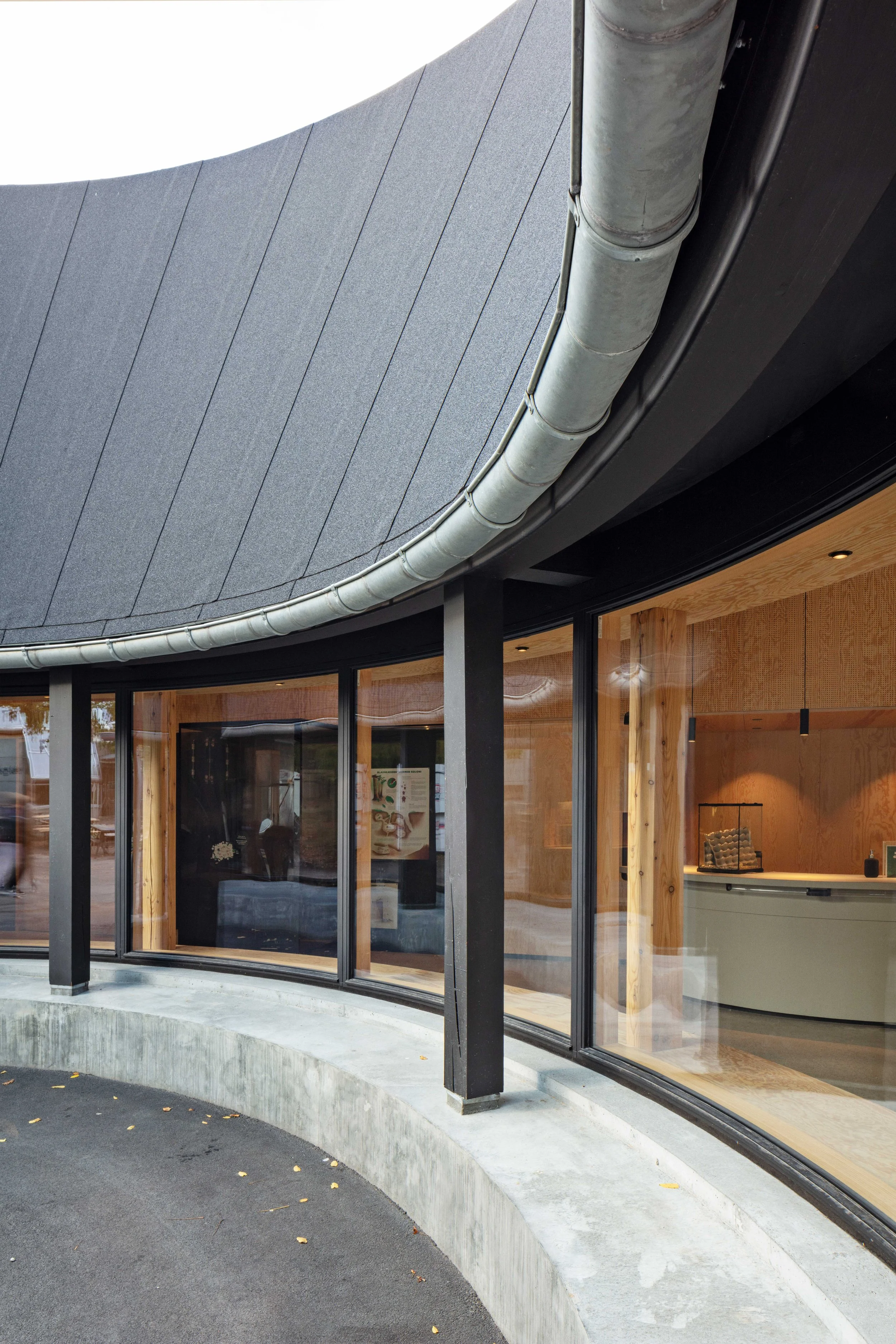 Bygningen er opført som et træhus med en bærende trækonstruktion og beklædt med vandrette træprofiler, som er sortmalet. Bygningens store tagflader er beklædt med tagpap, der lader den falde naturligt ind i havens stemningsfulde omgivelser. Indvendigt er rummene beklædt med krydsfiner i fyr, som giver en varm kontrast til facadens mørke udtryk. Fundamentet i beton er trukket op som både brystning og bænk i det buede gårdrum og fortsætter ind gennem huset som et slebet betongulv med tilslag.